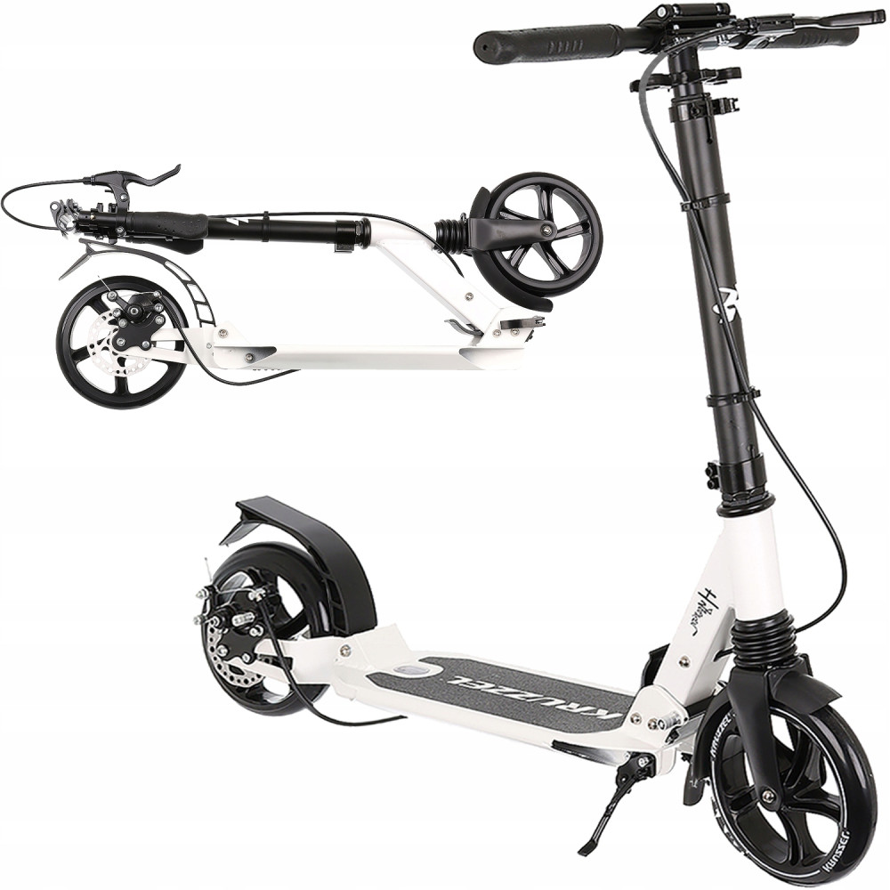 ✓ SPECYFIKACJA - kolor: czarno biały; materiał: aluminium + guma; 2 hamulce: tarczowy oraz błotnikiem; koła: gumowe; łożyska: ABEC-9; nóżka: tak; odblask: na tylnym błotniku; średnica kółek: 20 cm; wymiary: 97 x 37 x 105 cm; wymiary podestu: 37 x 14 cm; regulacja wysokości: 90 do 105 cm; waga: 6,5 kg; waga w opakowaniu: 7 kg.