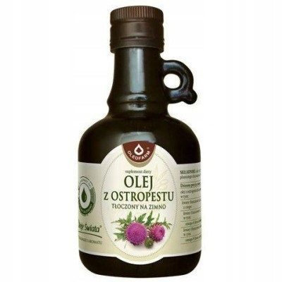 Olej z ostropestu otrzymywany jest z wysokiej jakości owoców ostropestu plamistego (Silybum marianum L.) metodą tłoczenia na zimno. Olej ten charakteryzuje się wyraźnym aromatem. Z tego względu stanowi doskonały dodatek do surówek, sałatek i innych potraw przygotowywanych na zimno. Olej z ostropestu charakteryzuje się wysoką zawartością tłuszczów nienasyconych, w tym wielonienasyconych kwasów tłuszczowych (NNKT), do których należą kwasy omega-3 i omega-6. Zastępowanie w diecie tłuszczów nasyconych tłuszczami nienasyconymi pomaga w utrzymaniu prawidłowego poziomu cholesterolu we krwi [jedno- i wielonienasycone kwasy tłuszczowe są tłuszczami nienasyconymi]. Utrzymanie prawidłowego stanu zdrowia wymaga zrównoważonego odżywiania i prowadzenia zdrowego trybu życia.