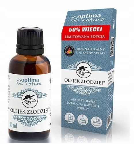 Unikalna mieszanka 100% naturalnych olejków eterycznych. Naturalny Olejek Złodziei to wyjątkowa kompozycja 6 wysokiej jakości olejków goździkowego, cytrynowego, cynamonowego z kory i liści, eukaliptusowego i rozmarynowego . Ma bardzo przyjemny i odświeżający zapach, który idealnie przyczyni się do poprawy mikroklimatu pomieszczeń. Świetnie sprawdzi się także w kąpieli, czy też w masażu aromaterapeutycznym.