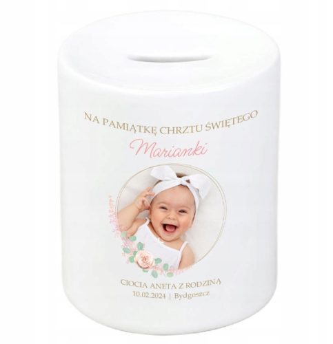 Personalizowana skarbonka z nadrukiem to uroczy prezent na chrzest dla chłopca / dziewczynki, który łączy w sobie praktyczność z sentymentalnym akcentem. Biała porcelanowa skarbonka jest eleganckim i trwałym przedmiotem, który może stanowić piękną pamiątkę z okazji tego wyjątkowego wydarzenia. Skarbonka z nadrukiem staje się w ten sposób nie tylko praktycznym miejscem do zbierania pierwszych oszczędności, ale również wartościową pamiątką z tej ważnej uroczystości.