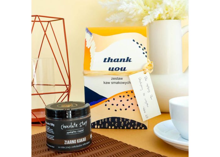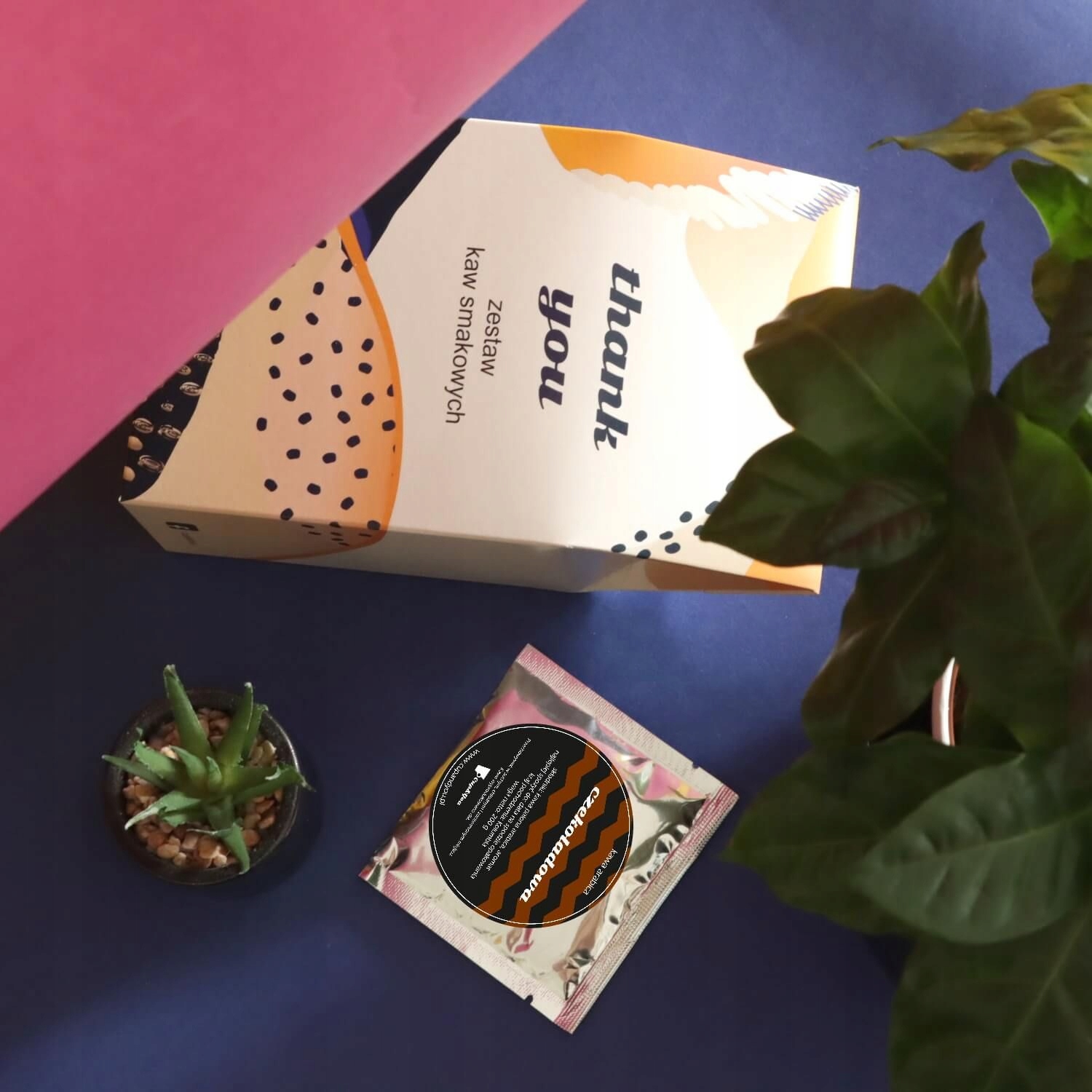 Zestaw kaw smakowych THANK YOU powstał z myślą o wszystkich bliskich nam osobach, którym chcemy podziękować w wyjątkowy sposób. Uniwersalny, a zarazem elegancki i aromatyczny zestaw sprawdzi się idealnie, gdy będziemy chcieli wyrazić naszą wdzięczność. Każdego ranka obdarowana osoba będzie mogła rozkoszować się pysznym smakiem Twojego upominku. Zestaw kaw smakowych THANK YOU sprawdzi się idealnie, gdy samo słowo „dziękuję” to za mało, dlatego podziękuj w oryginalny sposób – podaruj zestaw 10 saszetek z kawą, każda o innym smaku! Drobny upominek, który sprawi wiele radości.