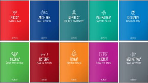 Komplet zeszytów przedmiotowych marki Herlitz. Miękka okładka wykonana z grubego papieru jest miękka w dotyku, dzięki wykończeniu folią soft touch. Na froncie, oprócz nazwy przedmiotu, znajduje się zabawny tekst, a na okładce wewnętrznej umieszczona są najważniejsze zagadnienia z danego przedmiotu! Taka "mała ściąga" dla każdego!