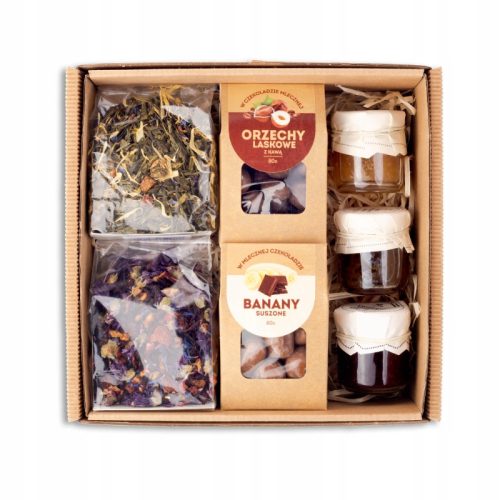 Zestaw HERBAT słodycze BANANY w czekoladzie ORZECHY konfitury na prezent