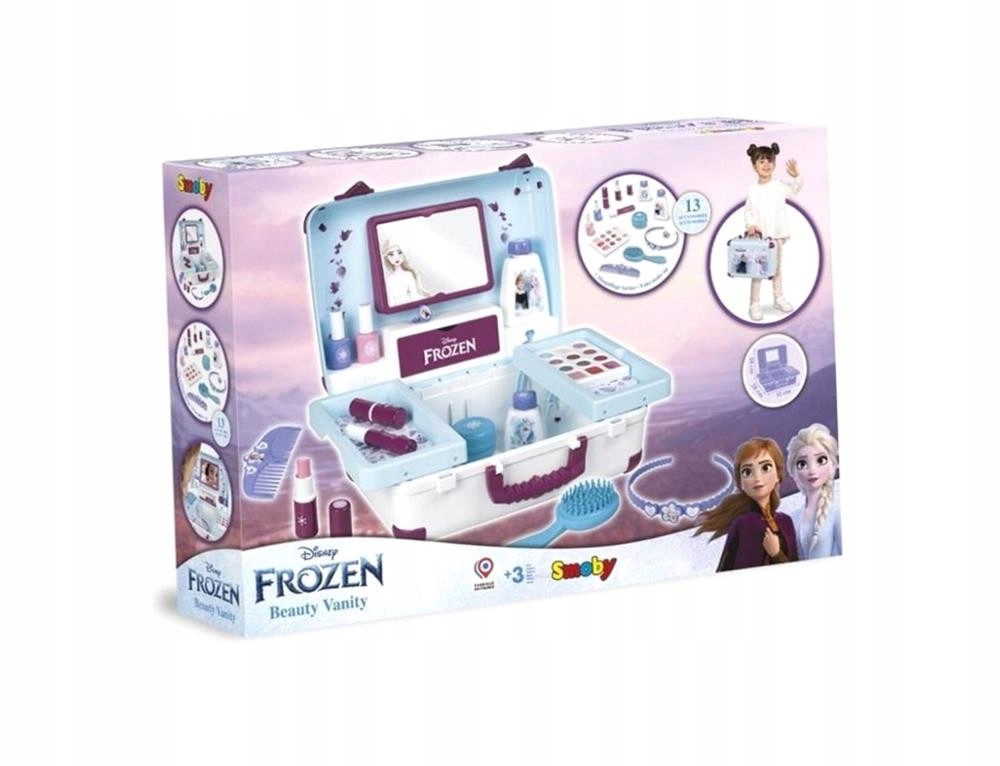 Walizka z 13 akcesoriami dla małej wizażystki w tym cienie do powiek, błyszczyki, lakiery do paznokci oraz akcesoria do włosów. Wszystkie akcesoria nie są prawdziwymi produktami.