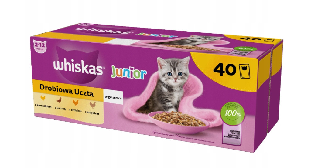 Pyszne kawałki jedzenia Whiskas Junior Drobiowa Uczta w galaretce są przygotowane tak, aby zachować naturalne zalety i smak w 100% wysokiej jakości składników. Każdy posiłek Whiskas jest starannie skomponowany i zawiera wszystko, czego potrzebuje Twój mały przyjaciel, aby rosnąć zdrowo i szczęśliwie.
