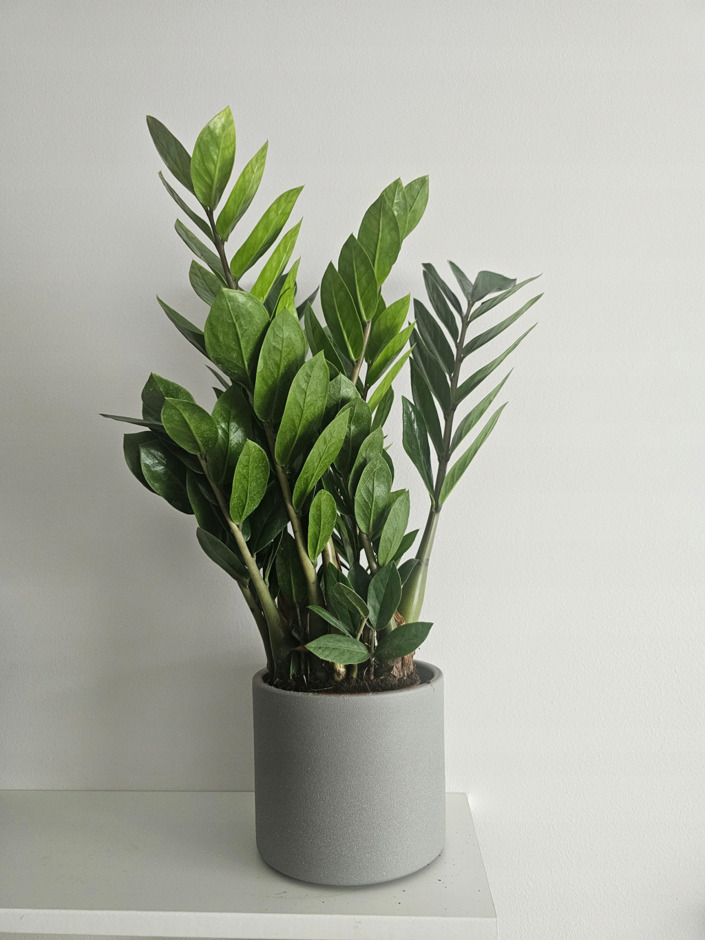 Zamioculcas to roślina doniczkowa o eleganckich, błyszczących liściach. Posiada mięsiste, skórzaste liście, które rosną na długich ogonkach, tworząc efektowne, gęste kępy. Dzięki swojej wytrzymałości i łatwości w pielęgnacji, zamioculcas jest idealnym wyborem do różnych wnętrz, od biur po mieszkania.