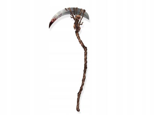 Składana kosa o nieregularnym kształcie z czachami i zakrwawionym ostrzem.