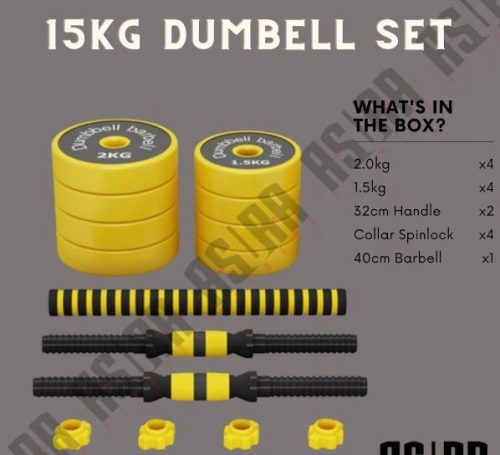 Skład zestawu - Model o wadze 15kg jest wyposażony w 2 x 16,5-calowe uchwyty, 4 x nakrętki, 4 x 2 kg obciążniki, 4 x 1.5kg talerze, 1 drążek łączący .