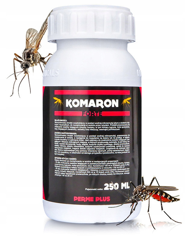 Oprysk na komary KOMARON FORTE to potężny koncentrat owadobójczy, opracowany specjalnie do zwalczania różnorodnych gatunków owadów, takich jak komary, muchy i meszki oraz mrówki, kleszcze i karaluchy. Środek na komary dzięki innowacyjnej formule w postaci wodnej mikroemulsji działa szybko i skutecznie, eliminując problem insektów latających i biegających. Koncentrat jest łatwy w użyciu i wymaga jedynie rozcieńczenia z wodą przed aplikacją, a użytkownik ma możliwość dostosowania stężenia roztworu do konkretnych gatunków owadów i warunków otoczenia.
