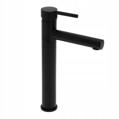 Wysokiej klasy mosiężna bateria umywalkowa, stojąca, jednouchwytowa ze stałą wylewką i podwyższonym korpusem w kolorze czarny-mat.
