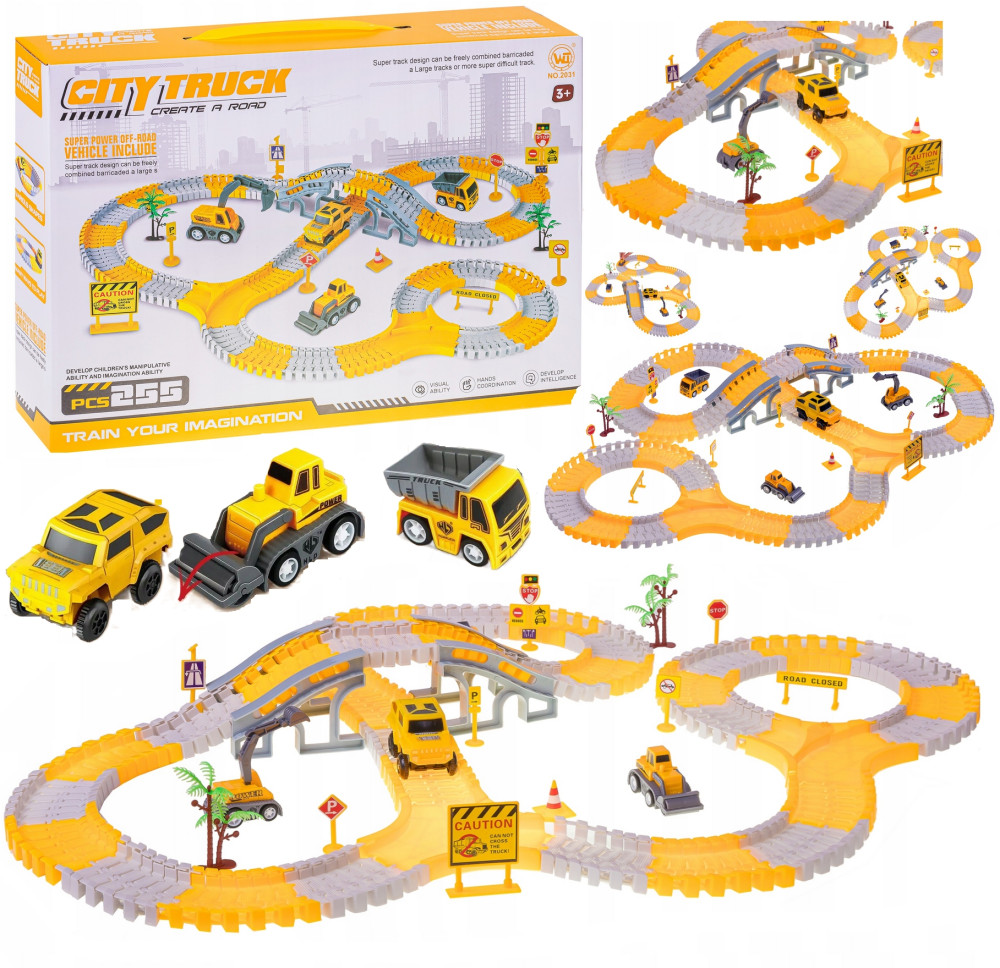 ⚡️Zestaw zawiera aż 234 elementy toru, 2 zwrotnice, 4 elementy mostu oraz wiele pojazdów budowlanych, włączając w to koparkę, walec, wywrotkę i wiele innych.